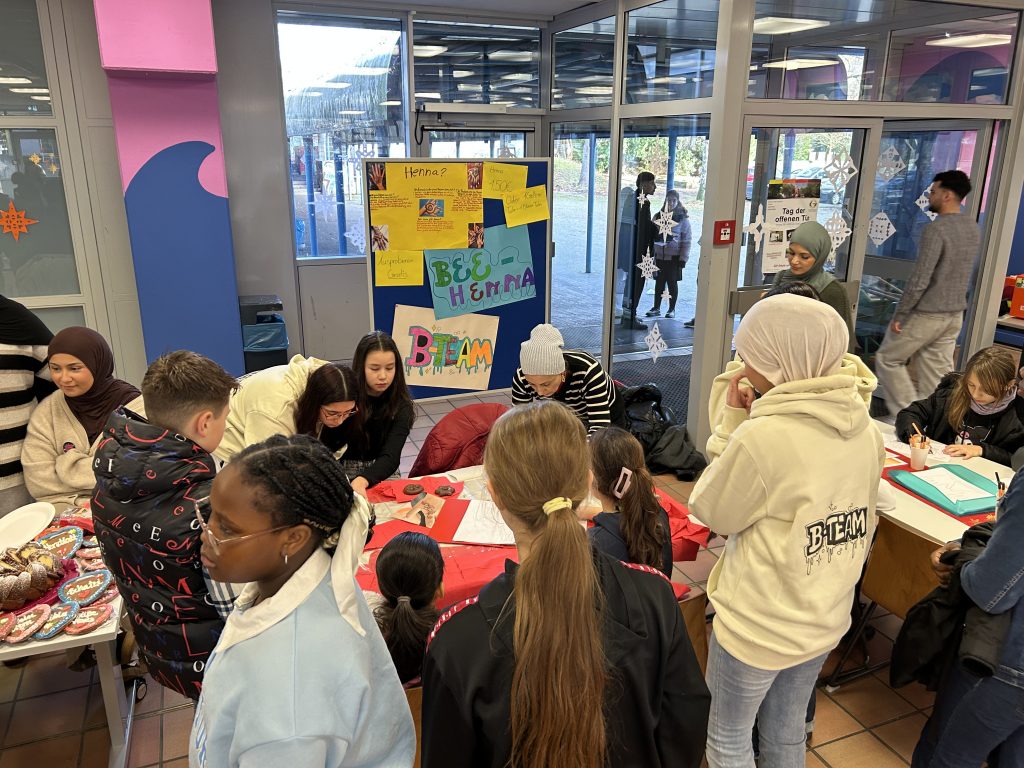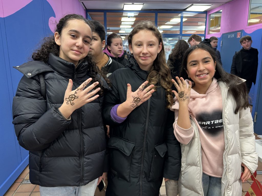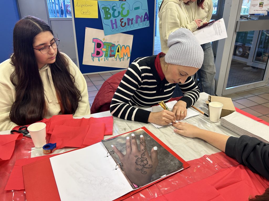 Ein besonderer Anziehungspunkt für die Besucherinnen und Besucher waren die phantasievollen Henna-Tattoos. Mit viel Kreativität, Geduld und Freude verschönerte das Team die Hände der Gäste. Unterstützt wurden die Schülerinnen und Schüler dabei von zwei sehr engagierten Müttern, die das Angebot tatkräftig begleiteten und so zum Gelingen beitrugen.
