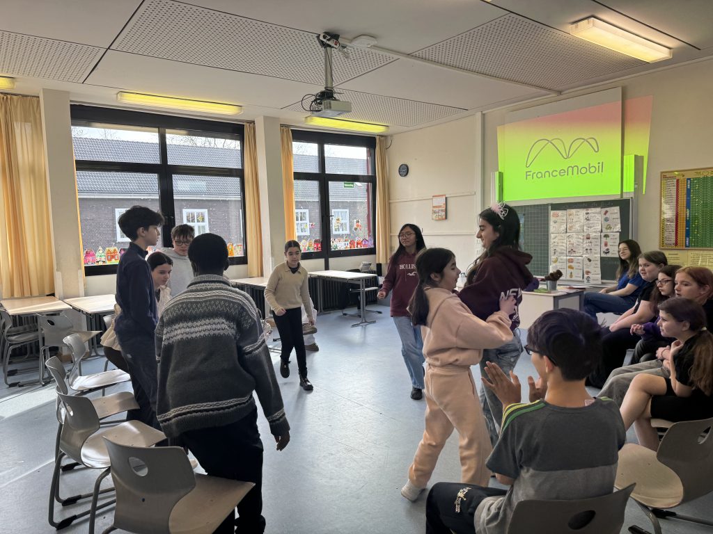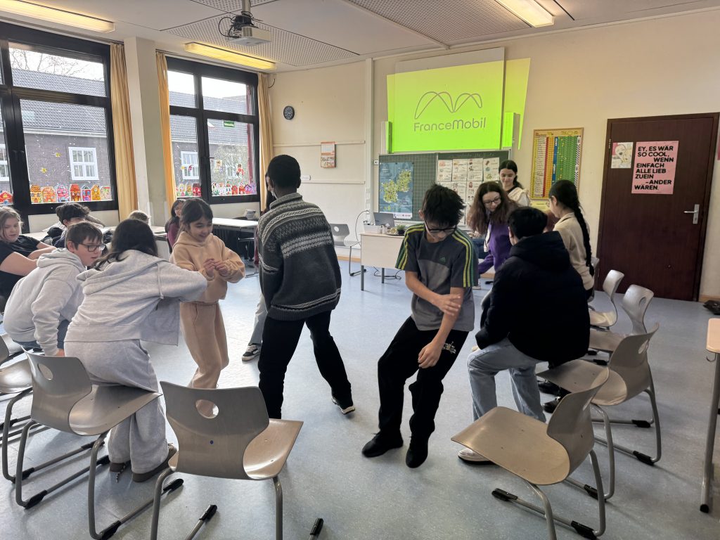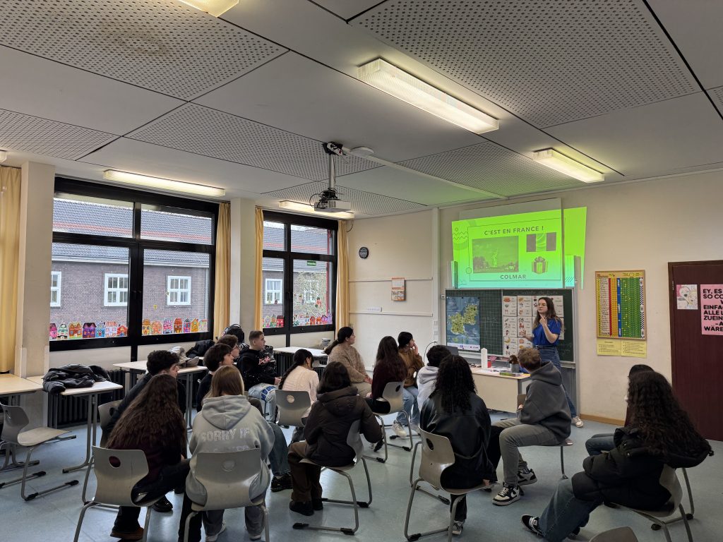 An diesem Tag leitete die Lektorin Sarah Kroner aus Straßburg die Workshops für die Jahrgänge 6 und 7. Frau Kroner brachte sprachliche Impulse und spielerische Übungen mit, sodass die Schüler*innen aktiv Französisch üben und die Kultur unseres Nachbarlandes lebendig kennenlernen konnten.