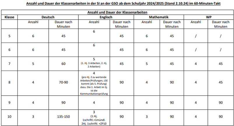 In der Sekundarstufe I gelten gemäß APO SI folgende Absprachen zu Anzahl und Dauer der schriftlichen Arbeiten.